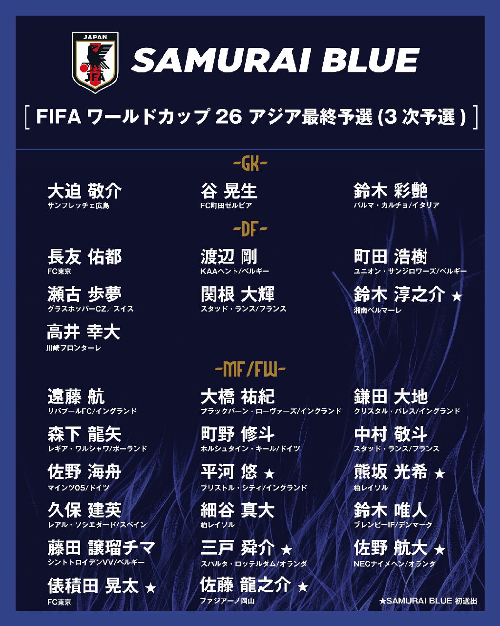 日本代表は前回3月シリーズですでにW杯出場を決めているなか、今回は最終予選で主力を担った選手を多く招集せず、初招集7人を含む14人を新たに抜擢。先発メンバーにも新たな顔ぶれが並び、DF関根大輝(スタッド・ランス)、MF俵積田晃太(FC東京)、MF平河悠(ブリストル・シティ)が先発でA代表デビューとなる。