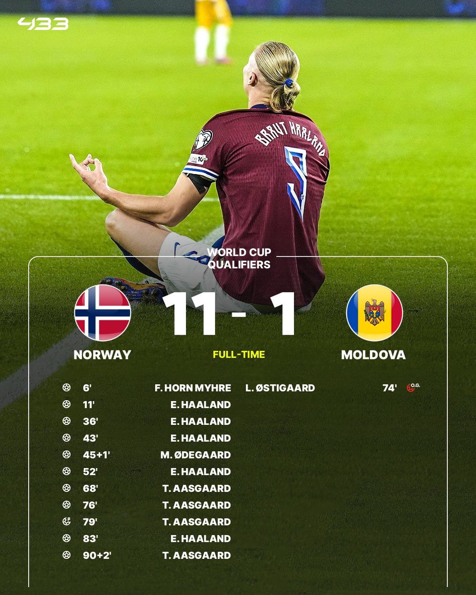 ノルウェー代表がモルドバ相手に11-1の圧勝。ハーランドが5得点し、攻撃陣が覚醒。W杯欧州予選で連勝を続ける彼らの強さを伝える。
