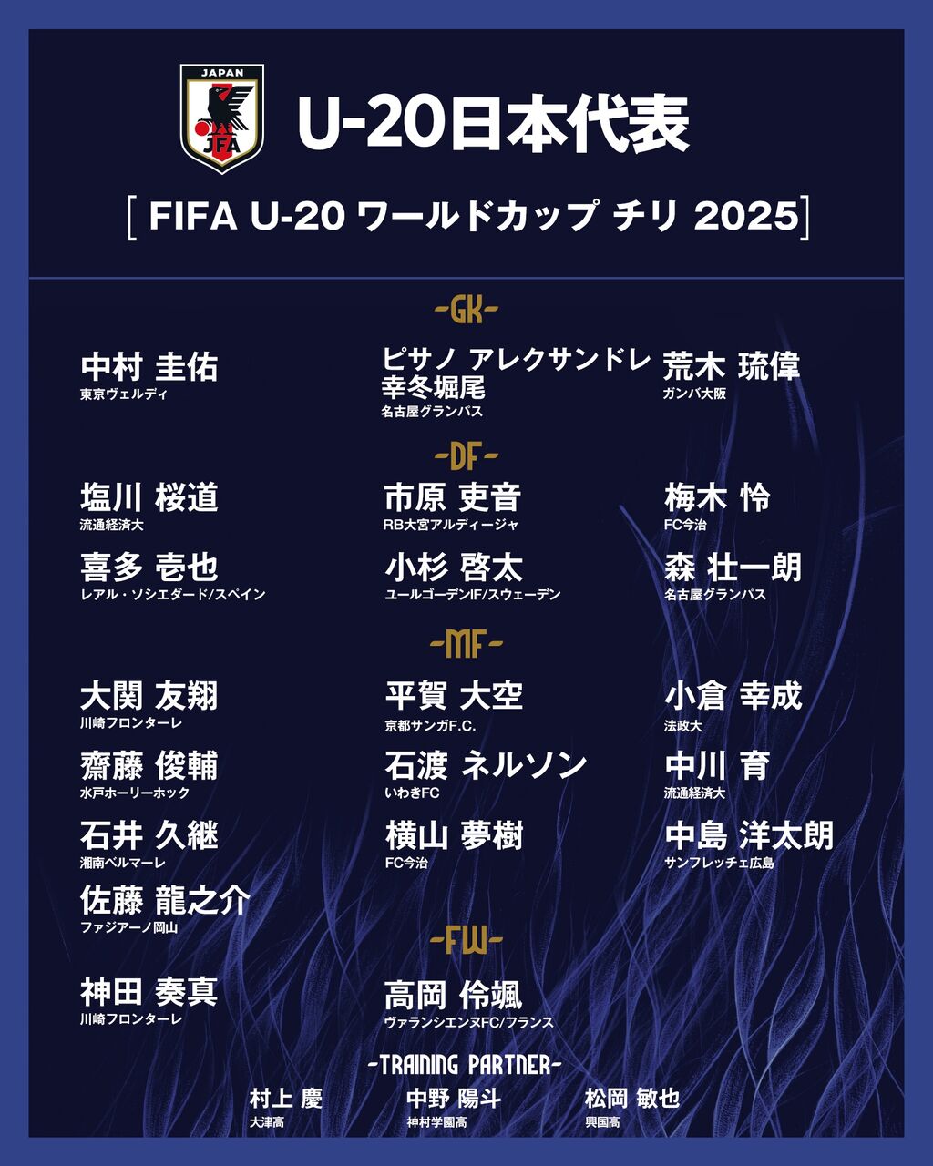 日本サッカー協会は12日、U-20ワールドカップチリ大会(9月16日~10月20日)に臨む、U-20日本代表21人を発表した。