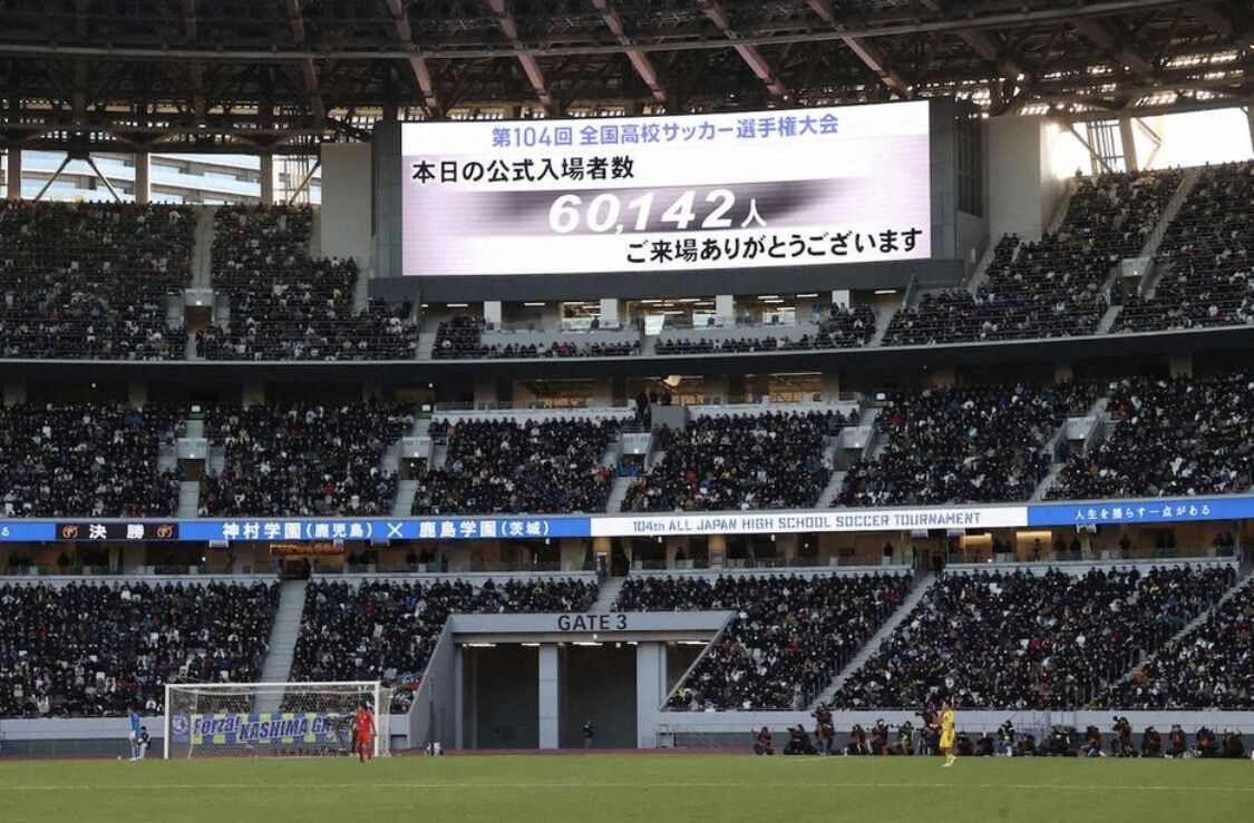 高校サッカーの決勝戦が歴史的な観客数6万142人を記録し、スタジアムが沸き立つ場面を報告。